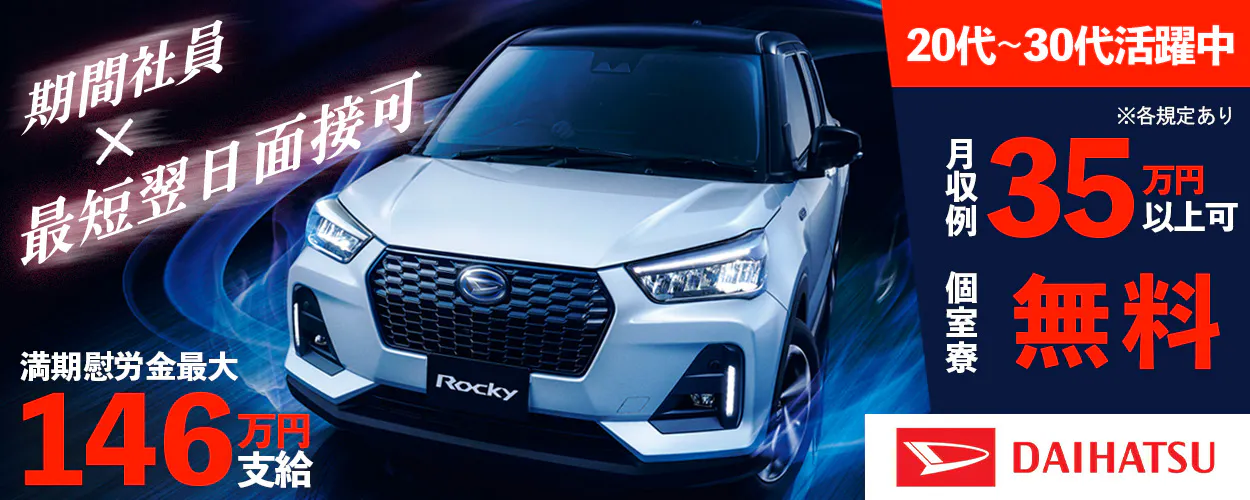 ダイハツ工業株式会社 【製造・加工・組立・整備】「寮無料・月収35.5万円・期間工」自動車系工場での組立・加工・プレス交替制 /未経験歓迎/交通費支給/女性活躍/20~40代活躍/高収入_707741 日給11,100~ 滋賀県蒲生郡竜王町 契約社員 未経験歓迎 女性活躍中 急募